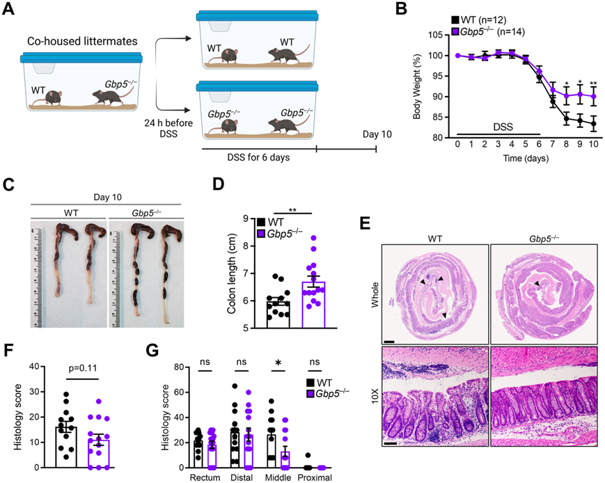 (A) 使用同窝野生型 (WT) 和Gbp5 –/–小鼠的实验性结肠炎模型的示意图。(B) 在模型建立的 10 天内小鼠体重的变化。 (C) WT 和Gbp5 –/–小鼠结肠长度的代表性图像。(D) 第10天,WT和Gbp5 –/–小鼠结肠长度的差异。 (E) 第10天小鼠结肠组织苏木精和伊红染色。 (F) 第 10 天WT和Gbp5 –/–小鼠结肠组织的组织学评分。 (G) 第 10 天WT和Gbp5 –/–小鼠结肠组织的组织学评分按区域分层。