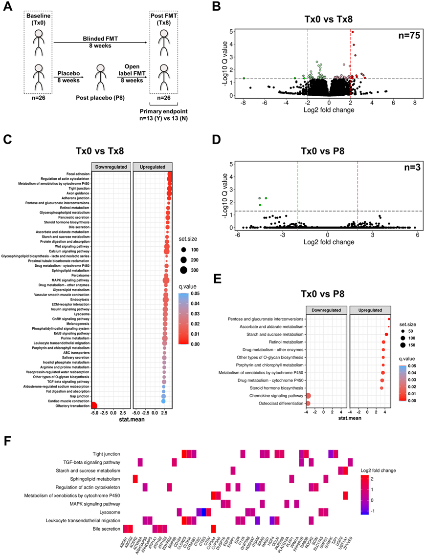 (A) 人类队列的抽样方案,Tx0,基线; Tx8,FMT 后8周; P8,安慰剂后8周。 (B) FMT 治疗 8 周后差异表达基因的火山图。(C) FMT 治疗 8 周后途径显著调节。 (D) 使用安慰剂治疗 8 周后差异表达基因的火山图。 (E) 安慰剂治疗 8 周后途径显著调节 。 (F) 确定在显著调控的感兴趣途径中差异表达基因。