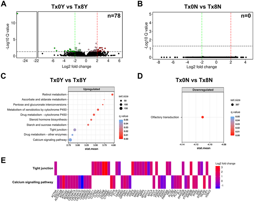 然后,他们在疾病缓解的背景下研究了 FMT 的效果,从而确定了应答者(Tx0Y 与 Tx8Y)和无应答者(Tx0N 与 Tx8N)表达的纵向变化。FMT 治疗观察到的变化是由应答者驱动的,应答者中的 78 个转录本与非应答者中没有显著差异表达(图 2A-B)。这与 GAGE 的途径分析高度一致,有 10 条通路在应答者中显著上调,而 1 条通路在无应答者中显著下调(图 2C-D)。在所有的途径中,紧密连接和钙信号最明显的两条途径,因为它们在FMT中是一致的结果,并且有大量相关基因发生变化(图2E)。