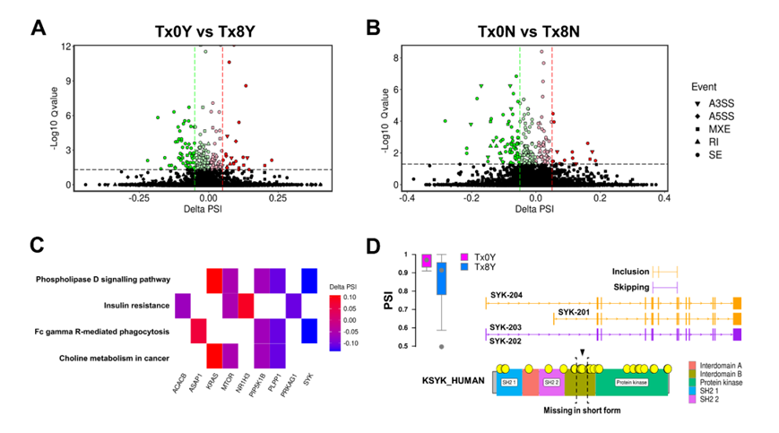 (A) 在FMT治疗8周后,应答者的选择性剪接(delta PSI)火山图。(B) FMT治疗8周后无应答者的选择性剪接火山图。 (C) 包含选择性剪接转录本的基因列表中具有显著调节KEGG通路。(D) 脾脏相关酪氨酸激酶SYK的选择性剪接事件导致蛋白质翻译的差异。