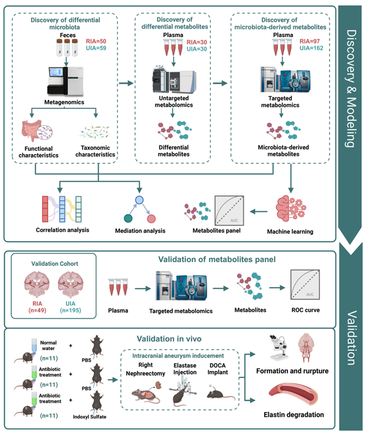 颅内动脉瘤(IA)是一种严重的神经血管疾病,影响了全球3%-5%的成年人。从未破裂IA (UIA)到破裂IA (RIA)的转变可导致蛛网膜下腔出血(SAH),与高发病率和死亡率相关。肠道微生物群已成为影响宿主代谢和免疫反应的关键环境因素,其生态失调通过微生物-肠-脑轴与各种脑血管疾病有关。马酚和牛磺酸等代谢物对IA的保护作用已有研究报道,但目前缺乏全面的大规模多组学研究RIA中的肠道菌群和代谢物表型。