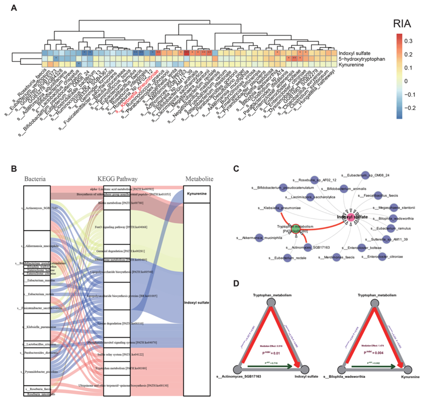 (A) 该热图详细描述了RIA与UIA中不同代谢物与微生物类群之间的相关性。 (B) 桑基图可视化了细菌物种之间的联系。(C) 网络图描绘了微生物群、硫酸吲哚酚和参与色氨酸代谢的通路之间复杂的相互作用。 (D) 定量评估特定细菌类群对中枢代谢物水平的贡献。