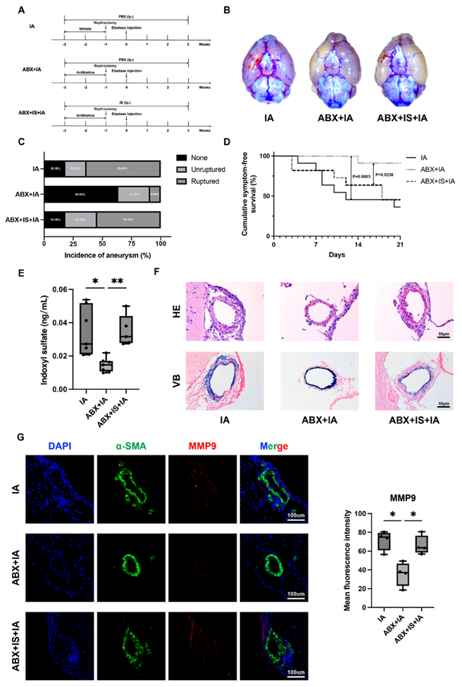 为了验证改变的肠道菌群和血浆IS的相关性,他们在右肾切除术前2周开始了抗生素鸡尾酒(ABX)处理的IA小鼠模型中IS的靶向代谢组学分析(图7A)。通过抗生素去除肠道菌群能够有效降低小鼠血浆中IS的浓度(图7E)。同时,与无ABX的IA小鼠相比,ABX处理显著减少了动脉瘤的形成和动脉瘤的破裂(图7B-C)。Log- rank检验进一步显示ABX+IA组的累积无症状率显著高于IA组(图7D)。