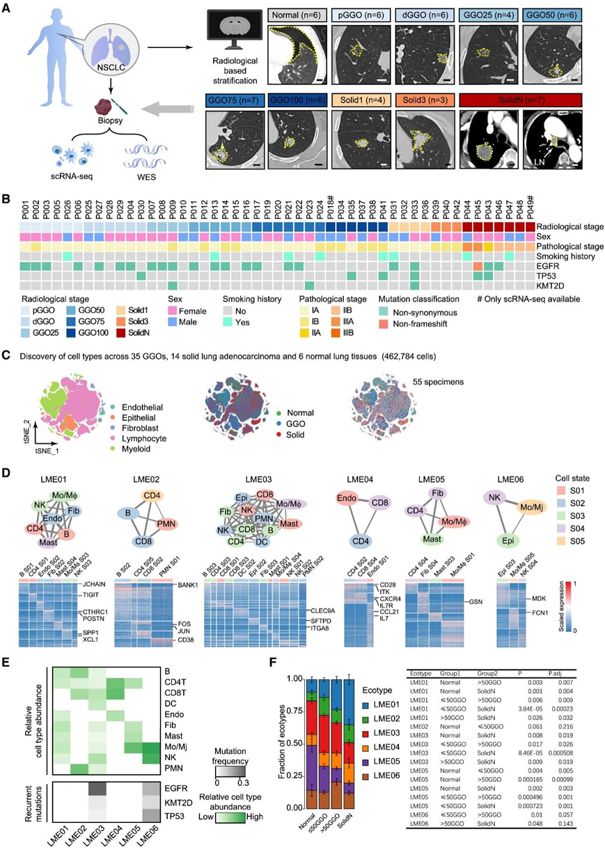 (A) 示意图描绘了基于放射学模式的分析框架和患者分层。(B) 原发性未经治疗的肺腺癌个体的临床特征概述。(C) 按主要细胞分区(左)、组织类型(中)或来自不同患者的样本(右)划分的 t-SNE(t 分布随机邻域嵌入)。(D) 在未经治疗的肺腺癌个体中检测到的肺恶性生态型。(E) 发现队列中 LME 的特征。(F) 不同放射学临床阶段的 LME 分数。