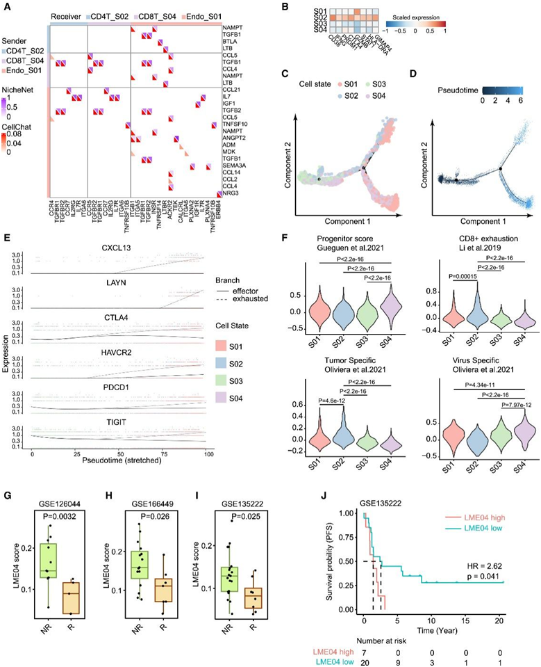 (A) 由 CellChat 和 NicheNet 算法预测的 LME04 内的细胞间通信矩阵。(B) 不同 CD8+ T 细胞状态下淋巴内皮细胞调节的 CD8+ T 细胞相关靶基因特征的表达谱。(C-D) 基于 Monocle 的 CD8+ T 细胞轨迹推断分析。(E)从根CD8T S03到CD8T S04再到CD8T S01(实线)和CD8T S02的耗尽基因表达动力学曲线。(F) 基于已发表的相应基因特征的平均祖细胞评分、耗竭评分、肿瘤反应评分和病毒反应评分的小提琴图。(G–I) 三个独立免疫治疗数据集中 LME04 生态型基因特征的箱线图。(J) 对 27 名接受抗 PD-1/PD-L1 治疗的晚期非小细胞肺癌患者进行 LME04 生态型特征的患者生存分层测试
