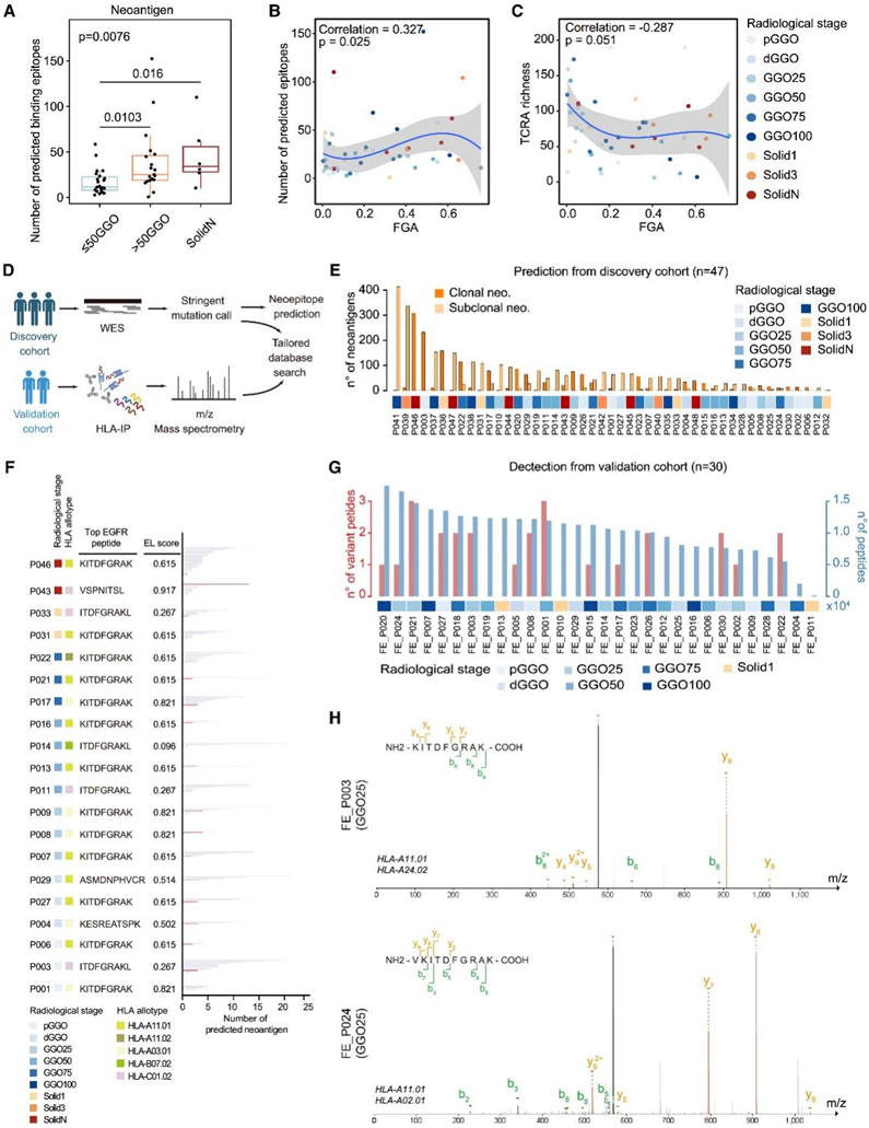 (A) 肺腺癌不同放射学阶段的新抗原数量。(B-C) 拷贝数变异和新抗原数量以及单细胞数据集衍生的 T 细胞受体多样性之间的 Pearson 相关分析。(D) 两个独立患者队列中新抗原检测的示意图。(E) 显示了源自单细胞数据的克隆和亚克隆表达的新抗原的患者水平数量。(F) 显示了验证队列中 HLA 免疫肽组检测到的新抗原。(G)通过 netMHCpan 算法预测的EGFR (L858R) 突变患者中突变相关新抗原的推定表现的多样性。(H)来自具有 GGO 放射学特征的肺腺癌患者的HLA 抗体免疫纯化的EGFR (L858R) 肽的串联质谱分析。