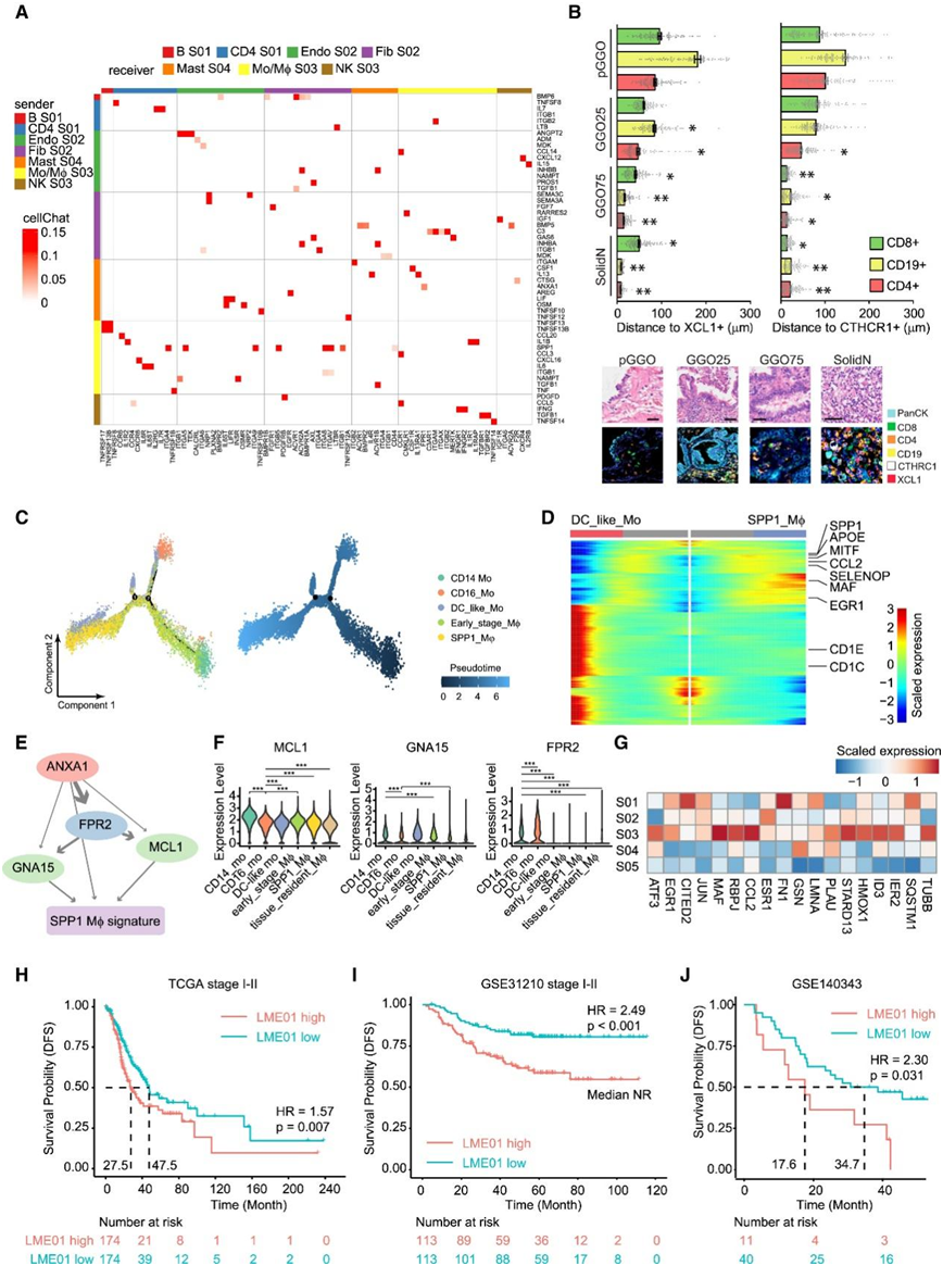 (A) 由 CellChat 算法确定的 LME01 内细胞间相互作用的矩阵表示。(B) 基于多重免疫荧光的肺腺癌进展过程中B 细胞、CD4+T 细胞和 CD8 + T 细胞与XCL1+ 细胞和CTHCR1+细胞的距离的定量。(C) 基于 Monocle 的 Mo/Mφ 轨迹推断分析。(D) Mo/Mφ 成熟过程中沿伪时间轨迹的标记基因表达。(E) 肥大细胞和肿瘤细胞来源的膜联蛋白 A1 (ANXA1) 与Mo/Mφ 表达的FPR2受体相互作用。(F)单细胞水平受体和下游信号分子的表达水平。(G)在Mo/Mφ的不同细胞状态下表达的ANXA1调节的靶基因的表达水平。(H–J) 生存分析。