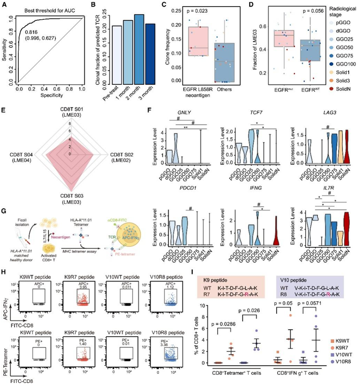 (A) 基于机器学习的建模,对识别 EGFR(L858R) 新抗原的 CD8+T 细胞进行分类。(B) 该模型预测在 2 个月的抗原治疗中最丰富的新抗原识别 T 细胞。(C) 识别 EGFR(L858R) 新抗原的 CD8+ T 细胞克隆更多地出现在 GGO 相关样本中。(D) 与其他EGFR野生型样本相比,早期 LME03 显示出更高的EGFR (L858R) 新抗原呈递频率。(E) EGFR (L858R) 新抗原识别 CD8+ T 细胞在每种细胞状态中的分布。(F) 肺腺癌进展时新抗原识别 T 细胞的效应因子和耗竭因子的表达。(G) HLA-A11.01 匹配的 CD8+ T 细胞的体外MHC 四聚体测定示意图。(H) EGFR (L858R) 新抗原相关 MHC 四聚体结合和细胞内 IFN-γ 浓度的流式细胞分析的代表性图像。(I)四个不同 HLA-A11.01 匹配供体中CD8+ T 细胞对EGFR (L858R) 新抗原的反应性的统计分析。