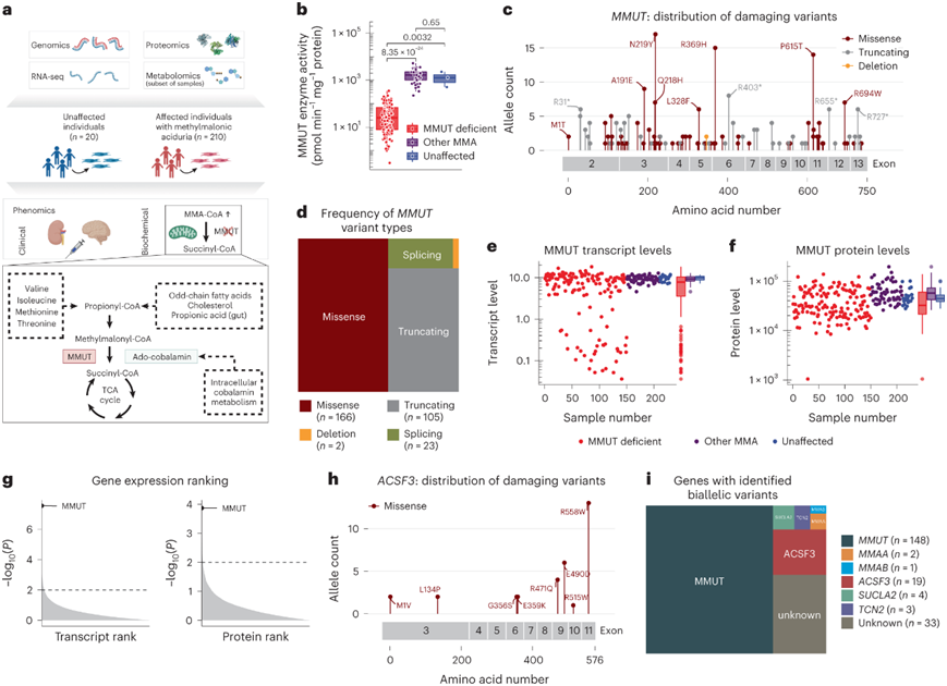 为了将对MMA的理解从致病的基因组病变扩展到受影响的生化过程,研究团队对230名个体(210名受MMA影响,20名未受影响)的成纤维细胞进行了高质量的全基因组测序(WGS)、转录组分析(RNA-seq)和基于diA - ms的蛋白质分型,这些个体主要来自欧洲,收集时间超过25年(图1a)。来自150名MMA患者的成纤维细胞的甲基丙二酰coa变位酶 /变位酶(MMUT)活性降低(MMUT缺陷),其中123名在补充辅助因子后没有增加,而60名患者的MMUT活性与对照组相似(其他MMA)(图1b)。在MMUT缺陷样本中,他们检索了WGS数据集,寻找MMUT基因的致病变异,并在150个人中确定了148人的分子致病原因。致病变异包括165个错义等位基因、105个截断等位基因、21个剪接等位基因、2个缺失等位基因和3个拷贝数变异,其中41个为新变异(图1c-d)。RNA-seq鉴定出与其他组相比,来自MMUT缺陷个体的细胞中MMUT RNA表达减少(图1e)。基于 DIA-MS 的蛋白质组检测显示,MMUT 缺陷的原代成纤维细胞中 MMUT 蛋白水平降低(图1f),分布在所有变体类型中。与所有其他样品相比,MMUT 代表了 MMUT 缺陷样品中最显著失调的 RNA 和蛋白质(图1g)。在剩下的60个样本中,他们在MMUT以外的基因中鉴定了22个个体的双等位致病变异:ACSF3、TCN2、sucl2和MMAB(图1h)。