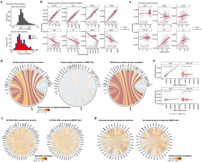 图4. 转录本-蛋白质和蛋白质-蛋白质相关性分析揭示了 MMUT 和 TCA 基因和蛋白质之间的协调关系,但不是它们的亚型。