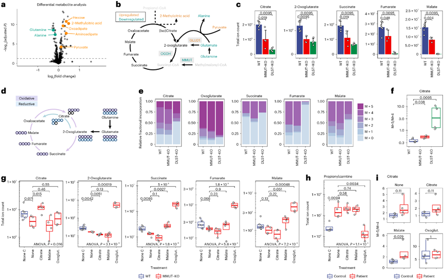 (a) 差异表达代谢物的火山图。 (b) TCA循环和相关重组的示意图。(c) 对照和 CRISPR/Cas9 KO 293T 细胞中的代谢物。(d) TCA循环标记和通过回补衍生自标记谷氨酰胺的相关代谢物的示意图。(e) 谷氨酰胺标记后TCA循环代谢物同位素异构体的相对丰度。(f) M + 5 和 M + 4 柠檬酸盐同位素同源物的比率。(g) 不同处理条件下TCA循环代谢物的总库大小。(h) 接受治疗的原代患者成纤维细胞中丙酰肉碱的水平。(i) 在原代成纤维细胞中处理下的M+5和M+4柠檬酸盐同位素同源物的比率。