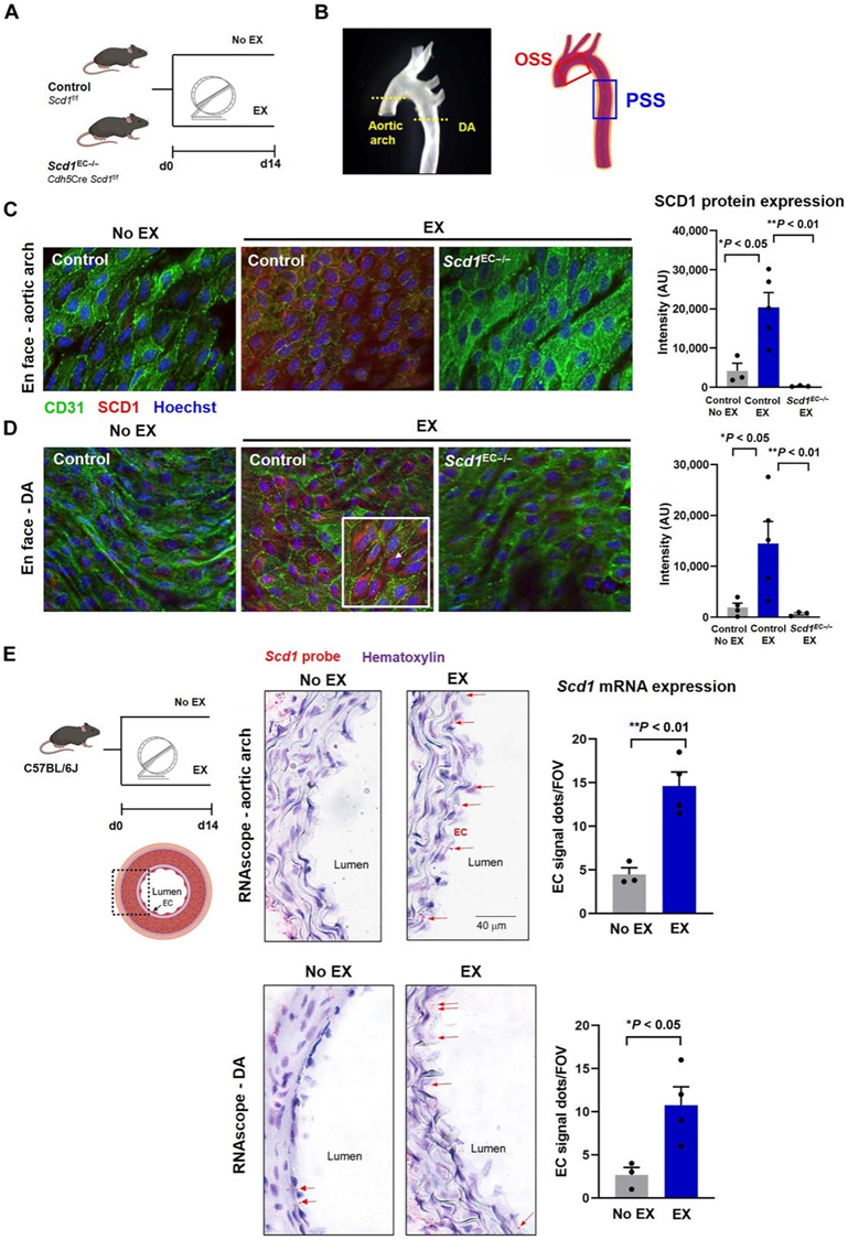 自愿轮跑2周后,自主转轮运行2周后,主动脉内皮的表面免疫疗法显示Scd1在主动脉弓下曲和降主动脉中的表达增加(图4B-D)。Scd1 染色在亚细胞核周区域突出,与报道的 ER 区域一致,而内皮特异性缺失 Scd1 (Scd1EC−/−) 小鼠中不存在 Scd1 染色。使用Scd1特异性探针的原位杂交(RNAscope)证实了野生型小鼠运动后主动脉弓和降主动脉内皮Scd1表达增加(图4E)。总之,运动增强的 PSS 与激活内皮 Scd1 表达有关。