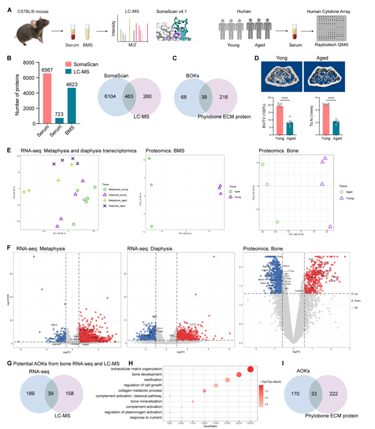 (A)实验流程。(B) SomaScan和LC-MS检测范围的比较。(C)骨特异性骨因子(BOK)和Phylobone鉴定的ECM蛋白重叠。(D)具有代表性的显微ct图像和组织形态学分析。(E) PCA。(F)火山图显示干骺端和干骺端deg和dep。(G)骨RNA-seq数据和LC-MS蛋白质组学数据中AOK的比较。(H)Go分析。(I) AOK和Phylobone项目ECM蛋白的重叠。