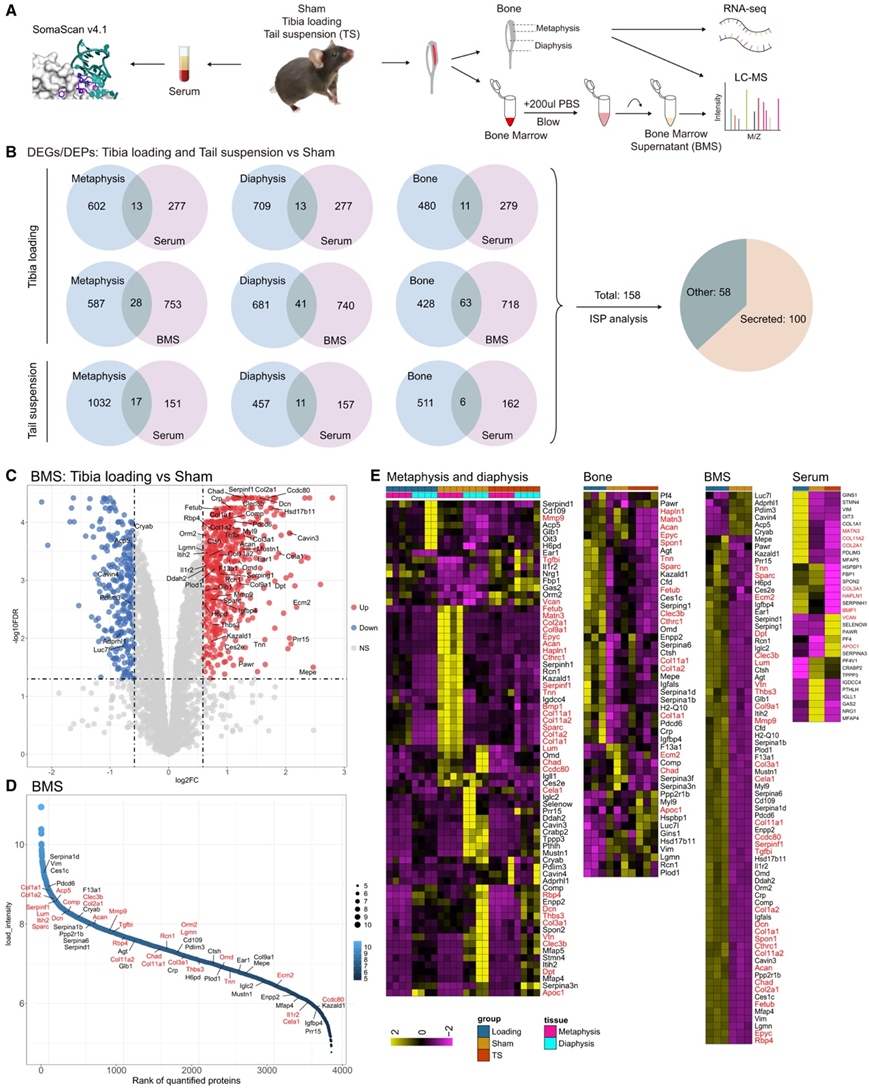(A) 骨组织的转录组学和蛋白质组学以及假手术小鼠、胫骨负载小鼠和尾悬吊小鼠的 BMS 和血清的蛋白质组学工作流程。(B) 骨中的 DEG 和 DEP 与细胞外液(血清和 BMS)中的 DEP 的比较以及分泌的预测。(C) 火山图以 BMS 中的蛋白质为特征。(D) 根据 MS 信号对 BMS 蛋白进行排序。(E) 热图显示干骺端、骨干、骨、BMS 和血清中的 MOK 表达。