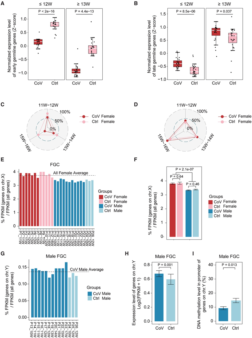 (A-B)箱形图显示了女性FGC和女性FGC中早期和晚期生殖细胞系标记基因的统一标准化表达水平。(C-D)雷达图显示女性FGC种系特异性标记基因的平均表达水平。(E-F) CoV组和Ctrl组FGC中X染色体上所有检测到的基因的表达水平与总基因的百分比。(G) CoV组和Ctrl组男性FGC中Y染色体上所有检测到的基因的表达量与总基因的表达量的百分比。(H) 男性 FGC 中 Y 染色体上检测到的基因的表达水平。(I) (H) 基因启动子中的 DNA 甲基化水平。