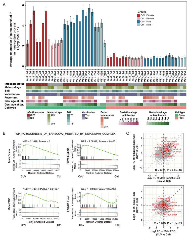 本项研究分析了母体感染SARS-CoV-2后胎儿种系的转录组和 DNA 甲基化组。孕早期(人类原始生殖细胞特化和表观遗传重编程的关键时期)的感染对FGC的发育影响甚微。此外,FGC 生态位的通讯不会因母体感染而受到损害。性腺微环境细胞中的一般免疫通路和 SARS-CoV-2 特异性免疫通路都极大地发生激活,以保护 FGC 免受母体感染。母体感染后FGC出现“提前”发育的趋势。本项研究深入了解了母体 SARS-CoV-2 感染对胎儿种系发育的影响,并为未来大流行提供了潜在的临床指导。
