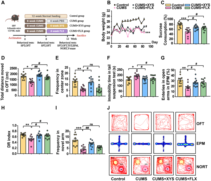 (A) 适应1周后,将小鼠随机分为如下四组:对照、CUMS、CUMS+XYS和CUMS+FLX。(B) 在整个研究期间每日体重变化。(C) 蔗糖偏好测试(SPT)。(D) 旷场测试(OFT)(移动总距离)。(E) OFT(中心区频率)。(F) 尾部悬挂测试(TST)。(G) 高架十字迷宫 (EPM)。(H) 新物体识别测试(NORT)。(I) Y型迷宫。(J) OFT、EPM 和 NORT 中小鼠的运动轨迹。