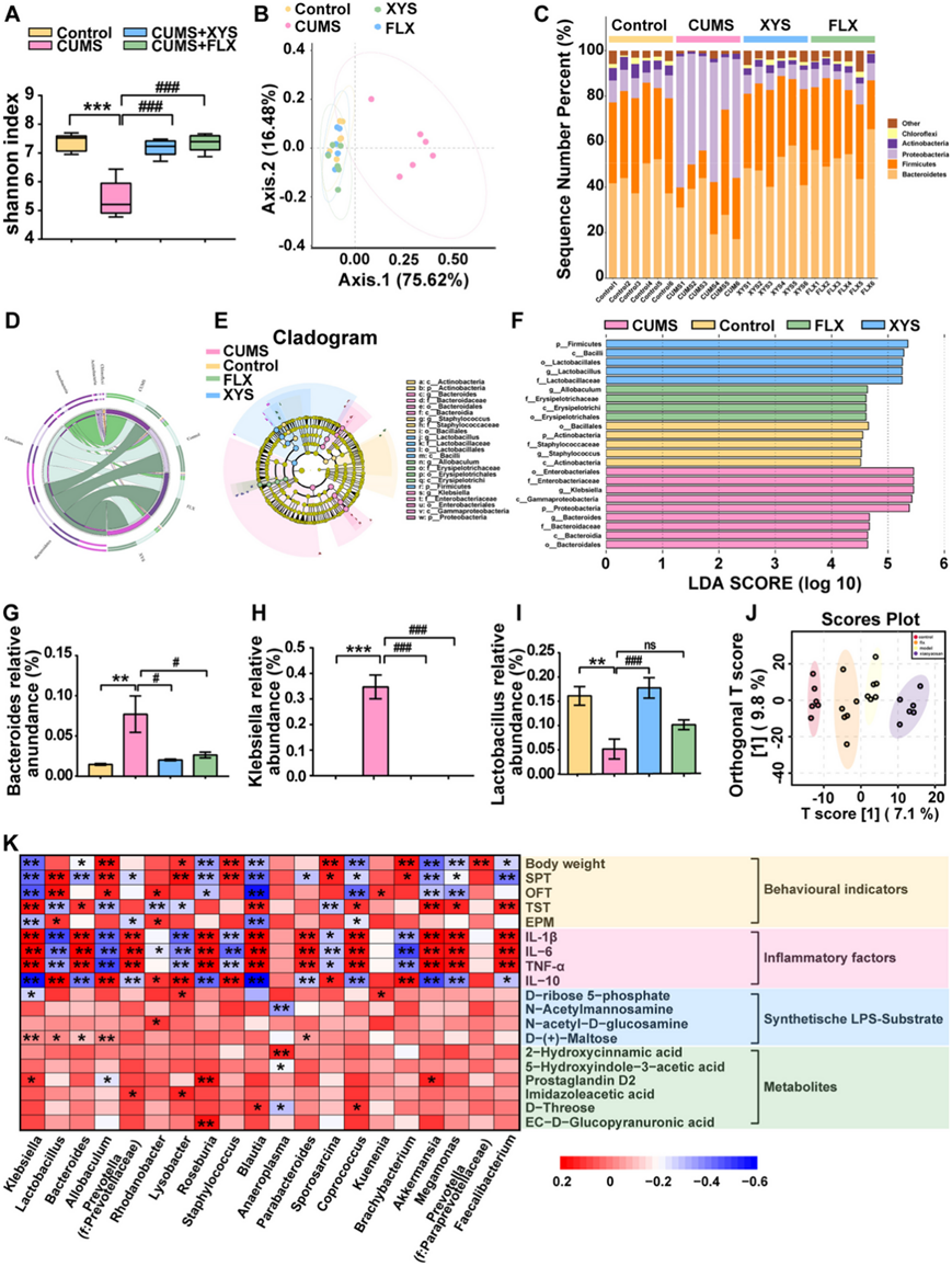 通过 16S rRNA 基因测序和 UHPLC-QTOF-MS/MS 分析评估抑郁症模型中肠道微生物群和肠道代谢物的变化以及抗抑郁药物的反应。香农指数显示的 α 多样性结果表明,具有抑郁样行为的小鼠肠道微生物多样性降低,并且可以通过口服抗抑郁药(XYS 或 FLX)恢复(图 4 A)。基于 Bray-Curtis 距离的主坐标分析 (PCoA) 揭示了对照小鼠和具有抑郁样行为的小鼠之间肠道微生物群结构的差异(图 4 B)。CUMS + XYS 组和 CUMS 组之间肠道菌群结构存在显著差异,表明口服 XYS 显著影响表现出抑郁样行为的小鼠的粪便微生物群结构。