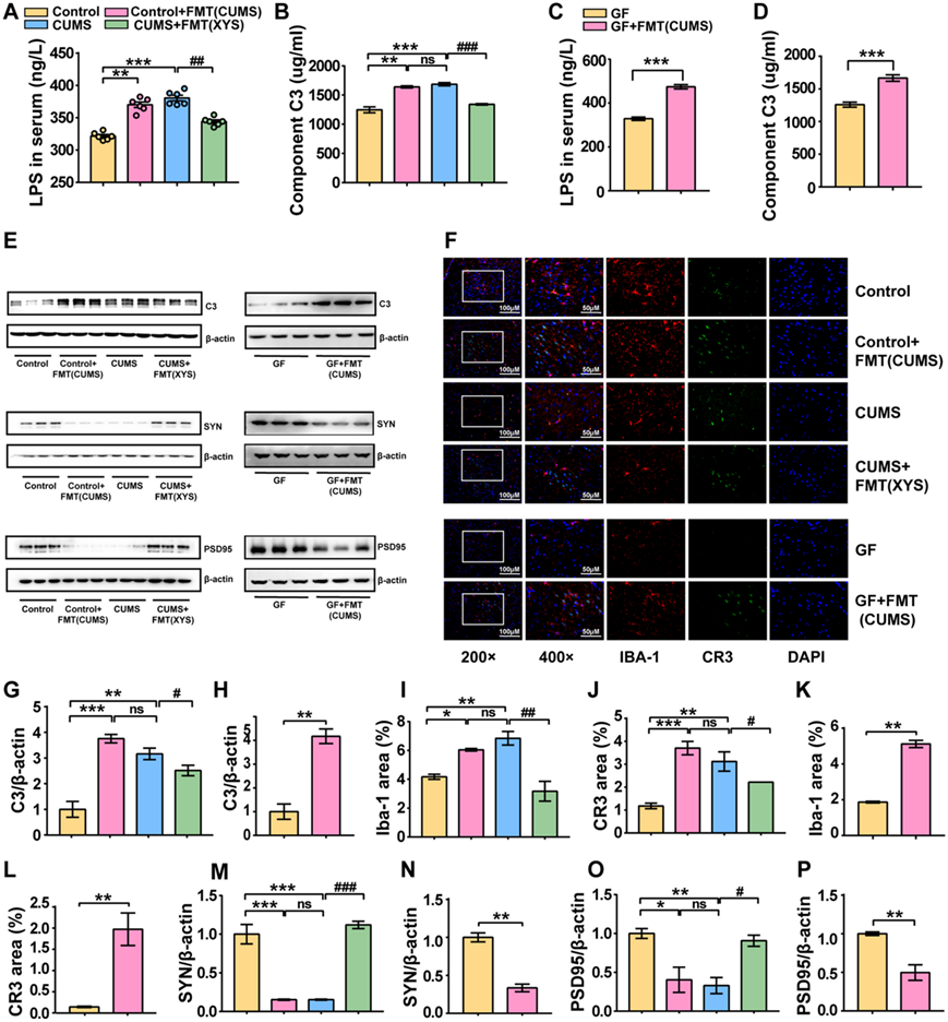 (A) 血清中的LPS。(B) 血清中的C3。(C) 血清中的 LPS 。(D) 血清中的C3。(E)免疫印迹分析。(F)免疫荧光分析。(G-H) C3蛋白的表达。(I) IBA-1蛋白的表达。(J) C3蛋白的表达。(K) IBA-1蛋白的表达。(L) C3蛋白的表达。(M-N) SYN蛋白表达水平。(O-P) PSD95蛋白的表达水平。