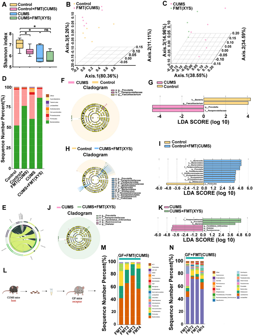 (A) Alpha 多样性。(B-C) PCoA 分析。(D) 门水平的肠道微生物群变化。(E) 肠道微生物群在门水平发生变化。(F-G) 分支图。(H-K) 进化分枝图。(L-N) FMT后GF门和属水平的肠道菌群变化。