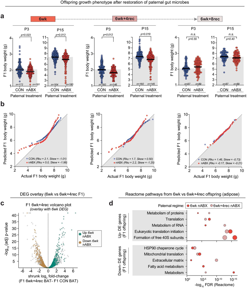 接下来,他们研究了父系从肠道菌群失调中恢复是否可以挽救 F1表型效应。在nABX停药4周后[6周+ 4 rec(恢复)],当父源微生物组的显著扰动持续存在时,F1后代再次显示出新生小鼠体重显著降低,对SGR的易感性增加和生长轨迹受损(图2a,图S3a-b)。然而,在停用nABX 8周后,当父源微生物组恢复时,他们观察到F1新生儿体重表型、nABX和正常发育生长同时恢复(图2b,图S3a-b)。此外,6周+ 4 rec nABX组的后代的F1死亡率显著升高,但在6周+ 8 rec微生物群恢复后,相同组的后代没有额外的死亡率(图2c-e)。