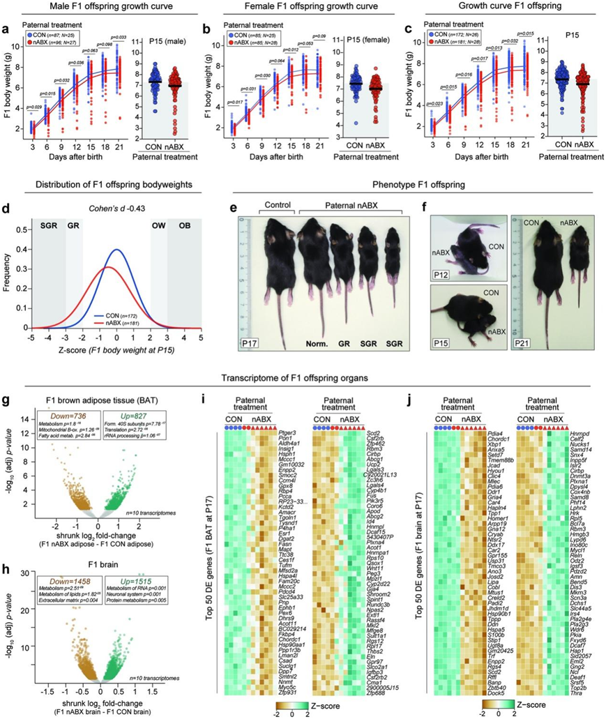 (a-c)生长曲线分析。(d) P15 时拟合的 F1 后代体重分布。(e) 代表性图像显示在 P17 时经 nABX 处理的公牛的 F1 后代生长表型范围,从正常到严重生长限制 (SGR)。(f) 在指定的出生后 (P) 天对照和 nABX 衍生的 F1 后代之间的其他表型比较。(g) 火山图显示了由失调父系所生的后代的棕色脂肪组织 (BAT) 中存在显著的 DEG。(h) 热图显示独立 F1 后代 BAT 中前 50 个上调和前 50 个下调基因。(i) 火山图显示 F1 后代大脑中显著差异表达的基因。(j) 热图显示根据父本处理,F1后代大脑中前 50 个上调和下调基因的表达。