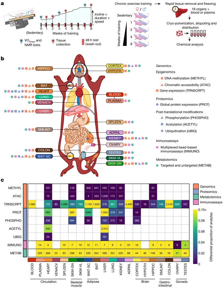 本项研究分析了雄性和雌性小鼠在八周的耐力过程中全血、血浆和 18 个实体组织中的时间转录组、蛋白质组、代谢组、脂质组、磷酸蛋白质组、乙酰蛋白质组、泛素蛋白质组、表观基因组和免疫组数。由此产生的数据概要包含 19 个组织、25 个分子平台和 4 个训练时间点的 9466 项检测结果。鉴定出数以千计的共有和组织特异性分子改变,并在多个组织中发现了性别差异。时间多组学和多组织分析揭示了对耐力训练适应性反应的广泛生物学见解,包括免疫、代谢、应激反应和线粒体通路的广泛调节。许多变化与人类健康相关,包括非酒精性脂肪肝、炎症性肠病、心血管健康以及组织损伤和恢复。本研究中提供的数据和分析将作为理解和探索耐力训练的多组织分子效应的宝贵资源。