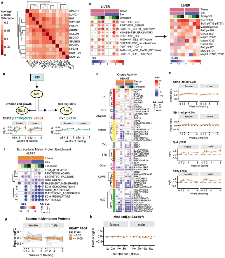 图S6. 耐力训练调节的调节信号通路。(a) 跨组织训练调节基因中 TF 基序富集差异的热图。(b)(左)肝脏的过滤 PTM-SEA 结果显示激酶和信号通路活性增加。(右)热图显示 HGF 信号通路内磷酸位点的 t 分数。(c) 运动训练期间 HGF 信号传导效应的模型图。(d) 过滤后的心脏 PTM-SEA 结果显示所选激酶在至少一个时间点具有显著富集。(e) 心脏中 GJA1 和 CDH2 蛋白丰度和Src 激酶磷酸位点靶标 GJA1 pY265 和 CDH2 pY820 丰度变化。(f) 使用基质体基因集数据库从心脏全局蛋白质组数据集进行基因集富集分析 (GSEA) 结果。(g) 记录心脏中基底膜蛋白丰度变化。(h) 心脏中 NTN1 蛋白丰度变化。