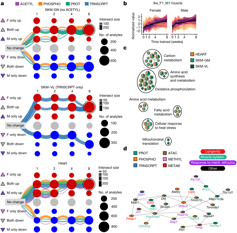 接下来,他们重点关注三个横纹肌(腓肠肌、股外侧肌和心脏)中共有的分子反应。在每种肌肉组织中,三条最大的图形聚类路径在第8周时趋于性别一致的响应(图4a)。由于在第 8 周时两性都有大量肌肉特征上调,因此他们进一步检测了相应的多组学分析数据集(图4b)。与这些差异特征相关的基因的通路富集分析表明,性别和肌肉一致的耐力训练反应反映了线粒体代谢、生物发生和翻译以及细胞对热应激反应的上调(图4c)。