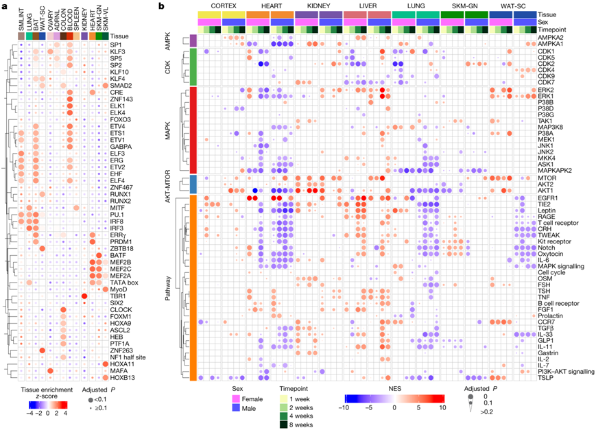 (a) 每个组织中训练调节转录本的转录因子基序富集分析。(b) 使用磷酸蛋白质组学数据的 PTM 特征富集分析来估计选定激酶和信号传导通路的活性变化。