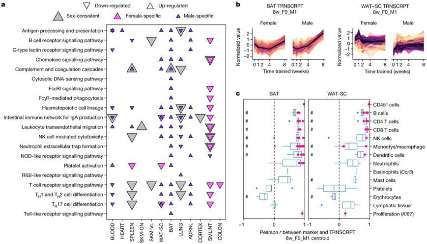 许多组织在训练反应中表现出性别差异,58% 的 8 周训练调节特征表现出性别差异反应。在肾上腺转录本、肺磷酸位点和染色质可及性特征、白色脂肪组织转录本和肝脏乙酰位点中观察到性别之间相反的反应。此外,促炎细胞因子在组织中表现出与性别相关的变化(图S11a-b)。大多数雌性特异性细胞因子在训练的第1周和第2周之间受到差异性调节,而大多数雄性特异性细胞因子在训练第4周和第8周之间受到差异性调节(图S11c)。