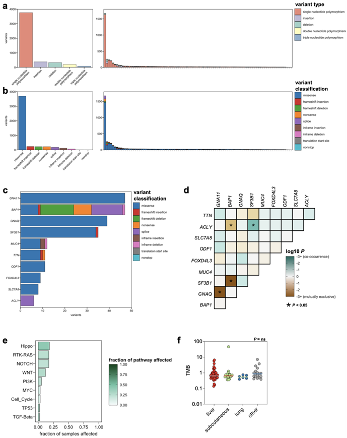 (a) 转移瘤中检测到的变异类型。(b) 在转移瘤中检测到特异性变异。(c) 队列中十个最常发生突变的基因。(d) 10种最常突变基因的体细胞相互作用分析。(e) 基因组突变对致癌信号通路的影响评估。(f) TMB与切除转移灶源组织的比较。