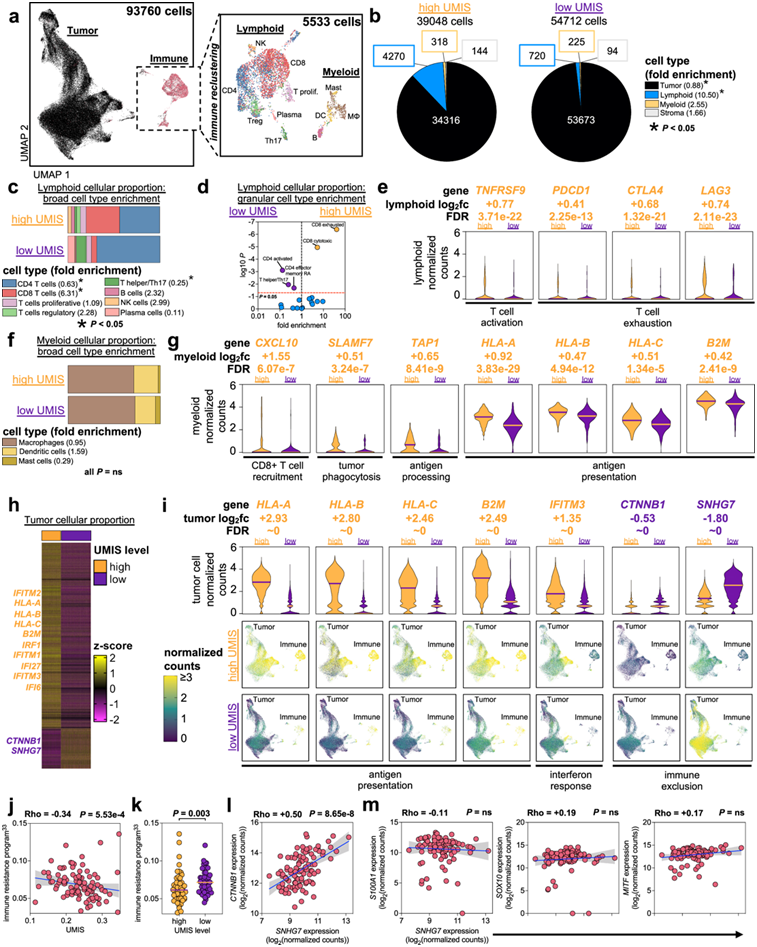 (a) 对 6 个 UM 转移瘤进行分析的所有细胞的均匀流形近似和投影 (UMAP) 图。(b) UMIS 组内总体细胞类型的比例。富集倍数是指比例(高 UMIS/低 UMIS)。(c) UMIS 组内淋巴广泛细胞类型的比例。(d) UMIS 组内淋巴颗粒细胞类型的火山图。(e) 从高 UMIS 与低 UMIS 淋巴细胞的差异表达基因分析中选择的基因。(f) UMIS 组内骨髓广泛细胞类型的比例。(g) 从高 UMIS 与低 UMIS 骨髓细胞的差异表达基因分析中选择的基因。(h) 高 UMIS 和低 UMIS 肿瘤细胞之间差异表达基因的热图。(i) 从高 UMIS 与低 UMIS 肿瘤细胞的差异表达基因分析中选择的基因。(j) UM转移瘤中UMIS与免疫耐药方案评分的相关性。(k) 按 UM 转移中的 UMIS 水平比较免疫抵抗计划评分。(l) UM 转移中 SNHG7 与 CTNNB1 转录本表达的相关性。 (m) UM 转移中 SNHG7 与典型黑色素瘤标记转录本(S100A1、SOX10、MITF)的相关性分析。