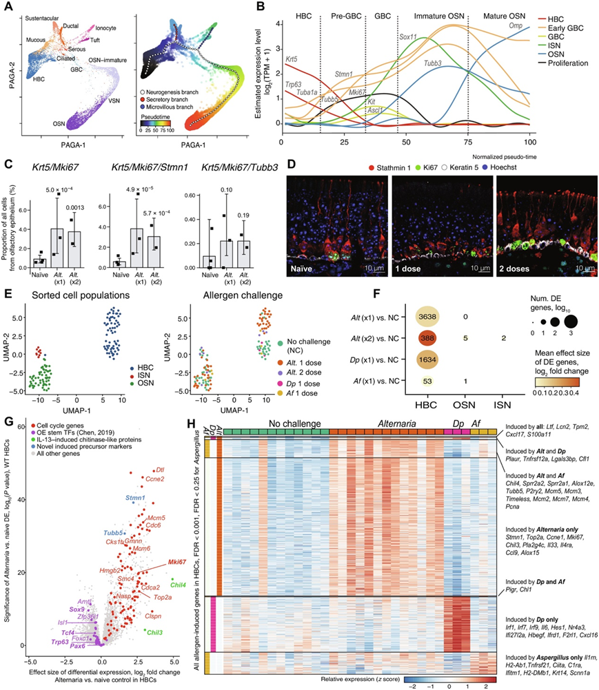 为了确定嗅觉干细胞生态位在过敏原暴露环境下的可塑性,他们对来自嗅觉上皮的上皮细胞和神经细胞进行了“伪时间”分析(图6A)。推断出的细胞状态轨迹(图6A)表明,HBC产生球状基底细胞,基底细胞依次沿主要途径分化为OSN和次要途径分化为mvc。随着神经发生的进展,早期表达显著变化的基因包括典型的HBC标记物,如Krt5和Trp63,而最新阶段的基因包括成熟的OSN标记物,如Omp、编码嗜铬粒蛋白A的Chga和Olfm1,用于olfactomedin 1(图6B)。正如预期的那样,球状基底细胞标记物Ascl1和Kit在中间阶段短暂激活(图6B)。在向OSN发展的早期,他们观察到一个参与细胞骨架调控的基因模块上调,包括stathin -1 (Stmn1)、α-微管蛋白(Tuba1a和Tuba1b)和β-微管蛋白(Tubb5)。经Alternaria吸入特异性诱导的细胞Mki67/Krt5/Stmn1三种标记呈现阳性,但Mki67和Tubb3未显示阳性(图6C)。他们使用免疫荧光验证了stathmin-1标记早期前体的一个子集,并且很少有增殖细胞对ISN标记TUJ1呈阳性,但有些细胞对stathmin-1呈阳性(图6D)。最后,组织学显示,Alternaria诱导了HBC形态的延伸,表明之前发现的活化HBC“从扁平的静态表型到金字塔型的增殖表型的形态转换”(图6D)。接下来,使用基底细胞粘附分子(BCAM)的组合,干细胞的标记物;NCAM1, osn和ISN的标记物和EpCAM,他们通过流式细胞确定了OSN的不同发育阶段。对EpCAMintBCAM+、EpCAMintNCAM1+和EpCAMlowNCAM1+进行了分类,利用组织学标记和bulk RNA-seq转录分析,分别将其鉴定为HBC、ISN和OSN(图6E)。然后,他们分析了在野生型(WT)小鼠中吸入三种不同的过敏原后,每个亚群的转录和组成可塑性:Alternaria、烟曲霉(Af)或Dermatophagoides pteronyssinus (Dp)。从转录的角度来看,单次吸入这些过敏原中的每一种都会引起HBC的显著变化(图6F)。来自Alternaria-小鼠的HBC中上调的基因主要由细胞周期相关转录本组成(图6G)。