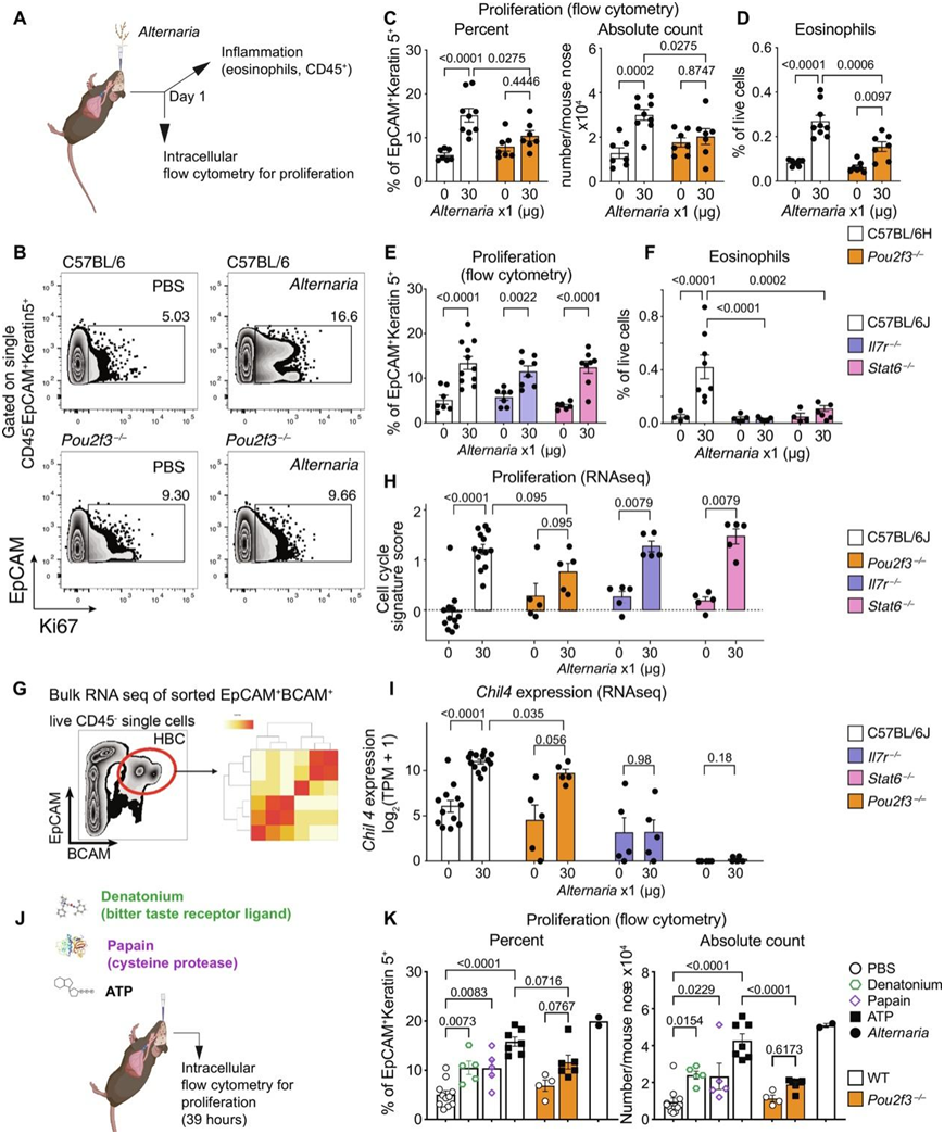 (A-I) 给指定基因型的小鼠鼻内给予单剂量Alternaria,评估鼻黏膜的干细胞增殖情况。(J-K) 流式细胞分析对Ki67核内染色评估Krt5细胞的增殖百分比和数量。