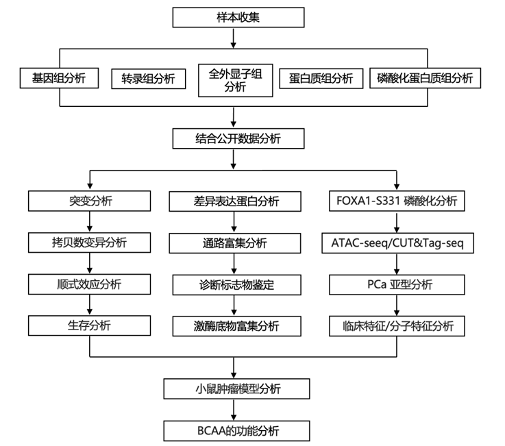 本项研究利用 125 名中国男性患者的配对肿瘤和附近组织对局部高风险 PCa 进行全面的多组学分析,突出了 GOLM1 作为非侵入性血清生物标志物的效用。磷酸化蛋白质组学分析揭示了 FOXA1 上 Ser331 磷酸化在调节 FOXA1-AR 依赖性顺反组方面的关键作用。蛋白质组学分析确定了三种不同的亚型,其中S-III是一种特别具有侵袭性的亚型,与预后不良和 BCAT2 分解代谢驱动的 PCa 进展有关。