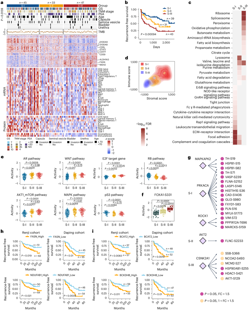 (a) 标准化蛋白质丰度及其关联的共识聚类。(b) 三种蛋白质组亚型中所有 113 名具有生存信息的患者无复发生存期的 Kaplan-Meier 曲线。(c) 通过 GSEA 基于蛋白质组数据对三种亚型进行 KEGG 通路富集分析。(d) 基于三种蛋白质组亚型的免疫评分(y轴)和基质评分(x轴)的二维密度轮廓图。(e) 三种亚型中肿瘤相关通路的活性。(f) 三种亚型中FOXA1-S331的磷酸化水平。(g) SI、S-II 和 S-III 中上调激酶的激酶底物网络。(h-i) Kaplan-Meier 曲线。