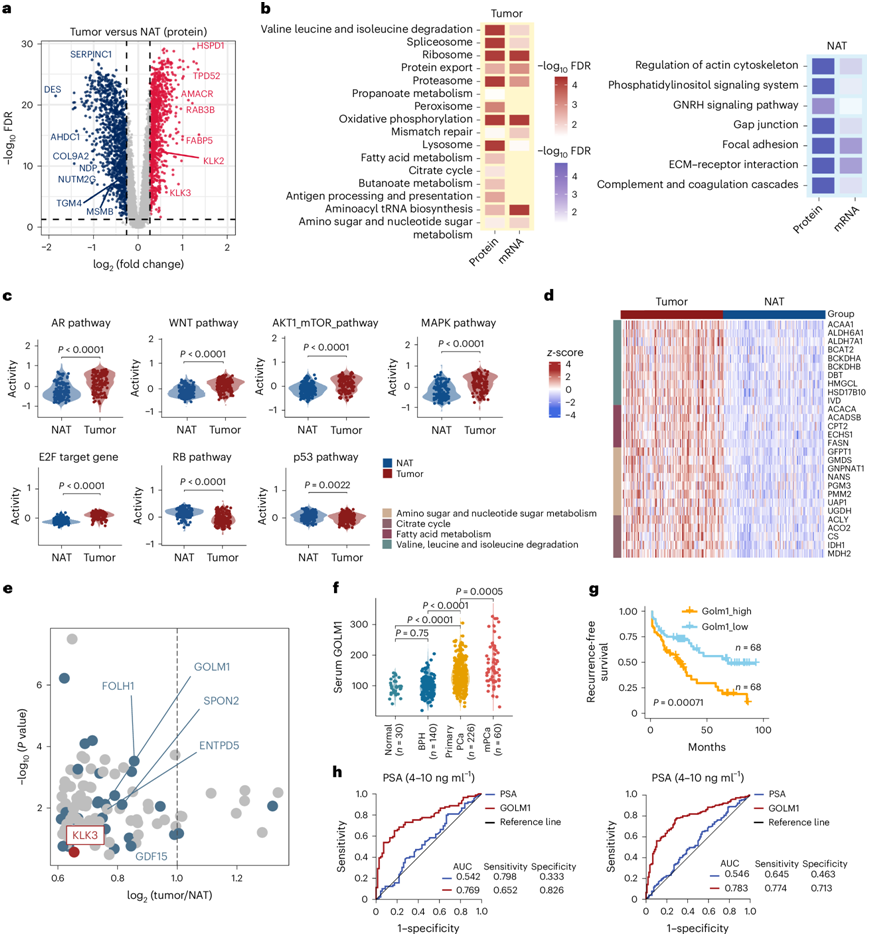 (a) 配对前列腺肿瘤和 NAT 之间的差异表达蛋白。(b) KEGG 通路富集分析。(c) 比较肿瘤样本和 NAT 中 PCa 相关通路的活性。(d) 肿瘤样本中富集的所示代谢通路中差异表达蛋白的热图。(e) 呈现潜在的血清诊断标志物。(f) PCa 患者血清 GOLM 表达水平的散点图。(g) 基于血清 GOLM1 水平的 PCa 患者无复发生存期的 Kaplan-Meier 曲线。(h) ROC 曲线包括 PCa 患者血清 GOLM1 和 PSA 的敏感性和特异性。