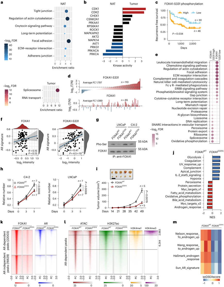 (a) KEGG 通路富集分析。(b) 通过 KSEA 评估肿瘤(红色)和 NAT(蓝色)中的激酶活性。(c)生存分析。(d) FOXA1 蛋白与 FOXA1-S331 磷酸化丰度分析。(e) 通路富集分析。(f) AR 信号活性与 FOXA1 蛋白表达水平和 FOXA1-S331 磷酸化之间的双侧 Pearson 相关性 。(g)免疫印迹分析。(h) 细胞生长曲线。(i)肿瘤体积。(j) 显著上调和下调的标志性通路。(k) CUT&Tag-seq 热图。(l) ATAC-seq 和 CUT&Tag-seq 谱。(m) 基于 ssGSEA 评分的 AR 信号传导。