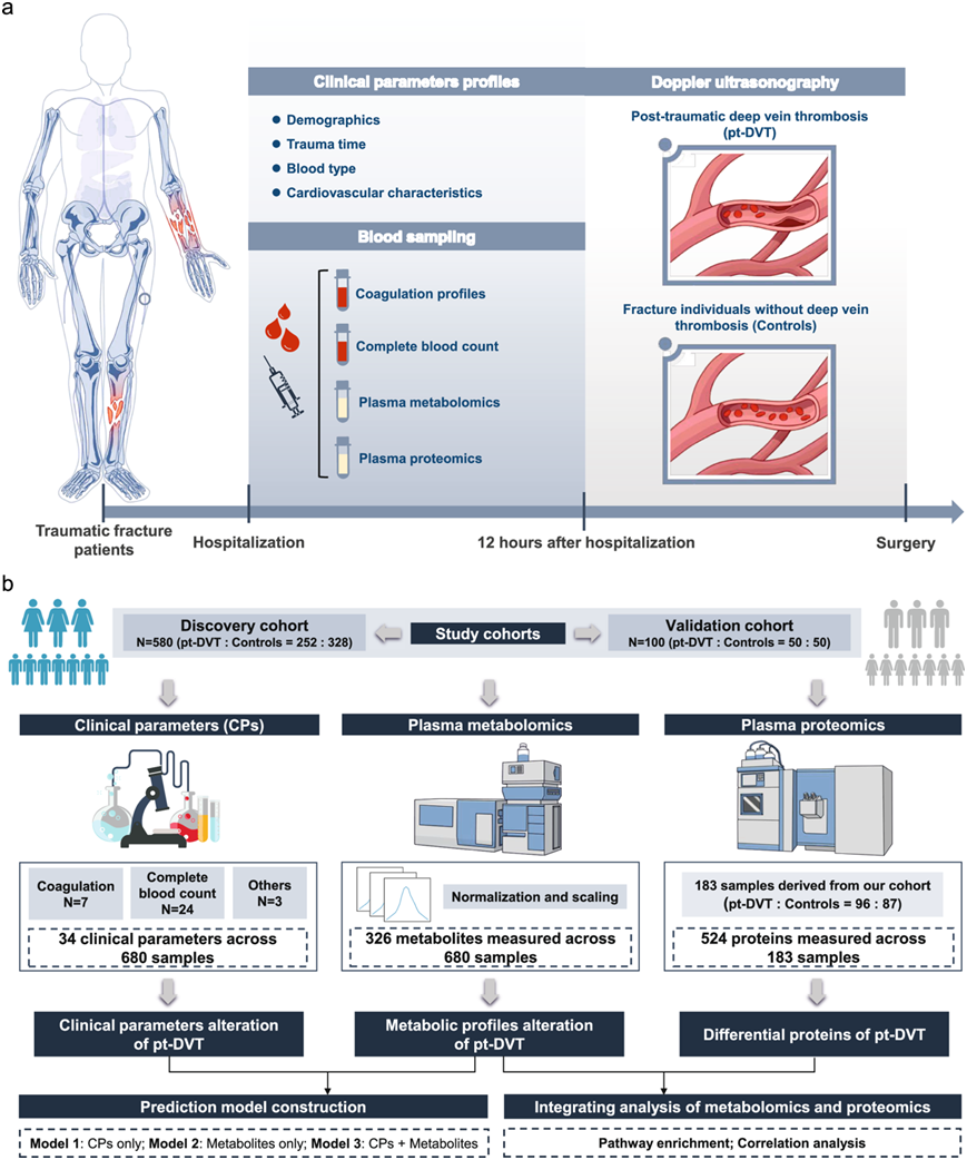 根据严格的纳入/排除标准,共 680 名患者纳入发现队列(N = 580)和验证队列(N = 100)。简而言之,对于发现队列,研究团队选择 252 名诊断为 pt-DVT 的患者作为病例,选择 328 名无 DVT 的患者作为对照,这些患者于 2018 年 10 月至 2020 年 12 月期间入组。随后,从 2021 年 3 月至 2021 年 7 月,选择了 50 名 pt-DVT 患者和 50 名对照,招募标准与单独的验证队列相同(图1a-b)。为了研究 pt-DVT 的潜在代谢机制并在创伤性骨折患者中识别 DVT 患者,他们采用非靶向代谢组学和液相色谱-质谱 (LC-MS) 技术系统地表征 pt-DVT 患者与对照组之间的血浆代谢物谱,并筛查与 pt-DVT 相关的血液学改变(图1a-b)。