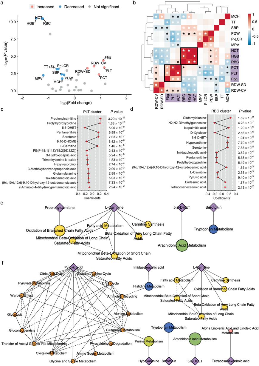 (a) 差异临床参数 (CP) 的火山图。(b)相关矩阵分析。(c-d) 使用线性回归模型对580名发现队列参与者进行pt-DVT相关代谢物与PLT聚类和RBC聚类之间的关联分析。(e-f) 与PLT 聚类和 RBC 聚类相关的代谢失调。