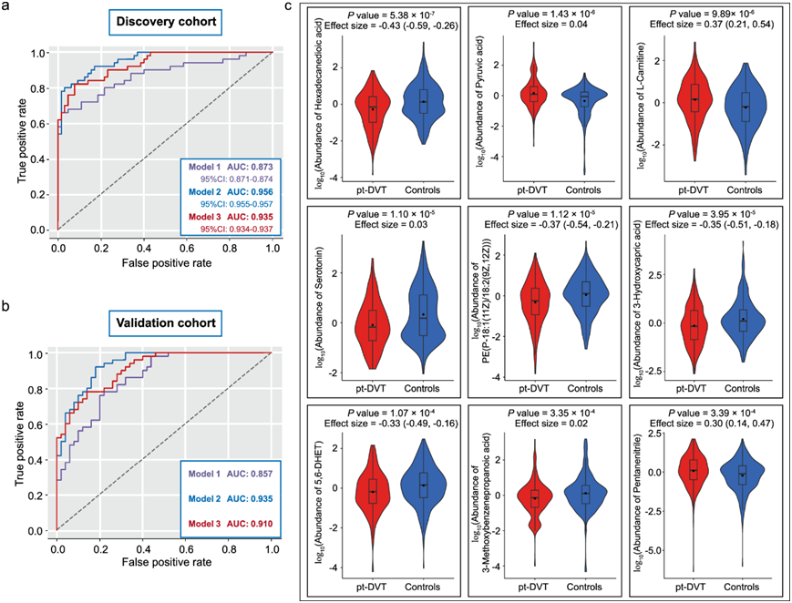 为了验证预测模型的泛化能力,他们对来自独立验证队列的 100 名参与者进行了代谢组学分析。首先,他们使用上面确定的所有显著改变的 CP和代谢物评估了三个模型的性能, 发现包含 28 种代谢物的模型 2 和包含 42 个预测因子的模型 3 在发现队列和验证队列中均表现出出色的可预测性。仅使用 CP 预测 pt-DVT 的模型 1(发现队列:AUC = 0.873,验证队列:AUC = 0.857)的性能最差,这表明仅使用 CP 可能不足以目前诊断 pt-DVT(图5a-b)。相应地,模型 2(发现队列:AUC = 0.956,验证队列:AUC = 0.935)和模型 3(发现队列:AUC = 0.935,验证队列:AUC = 0.910)能够很好地区分 DVT 与创伤患者,这表明血浆代谢物在临床上对 pt-DVT 早期诊断和预测具有重要贡献(图5a-b)。尤其是包含9种代谢物[十六烷二酸、丙酮酸、L-肉碱、血清素、PE(P-18:1(11Z)/18:2(9Z,12Z))、3-羟基癸酸、5,6-DHET、3-甲氧基苯丙酸和戊腈]的模型2的性能在发现队列和验证队列中均优于其他模型,表明其具有更好的可预测性和泛化能力(图 5c)。