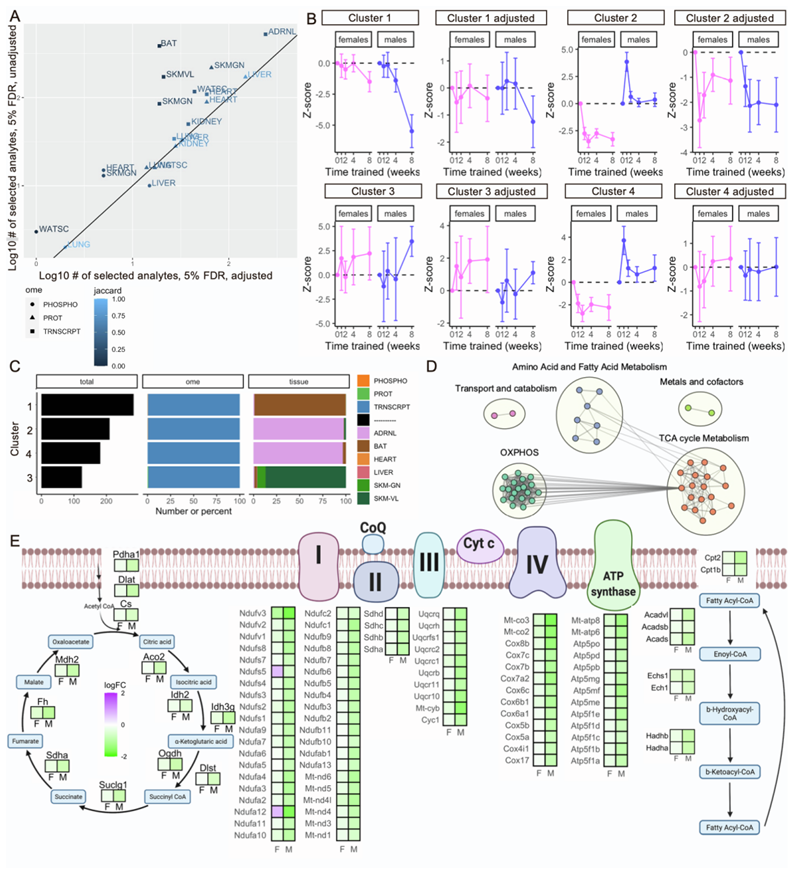 本项研究发现训练引起肾上腺、棕色脂肪、结肠、心脏和骨骼肌的多组学水平上的显著变化。结肠表现出非线性反应动力学,而线粒体通路在棕色脂肪和肾上腺组织中下调。肝脏中蛋白质乙酰化增加,脂质代谢发生变化,而横纹肌中氧化蛋白质增加。在人类糖尿病和肝硬化中,运动上调的蛋白网络发生下调。中枢网络蛋白HSD17B10的敲低会增加耗氧量,表明代谢应激。本项研究提供了线粒体对运动训练的反应的多组学图谱,并确定了与线粒体功能障碍相关的关键分子。