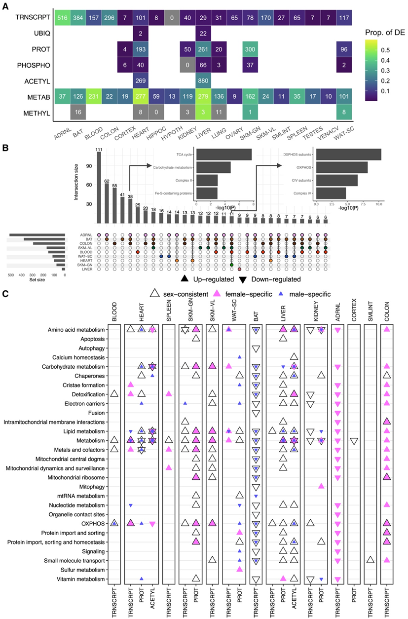训练调节了所有组织中与线粒体相关的分析物。总共有719个基因,占所有与线粒体相关转录本的63%,以及513个蛋白质(占所有与线粒体相关蛋白质的38%)在至少一种性别和组织中因训练而显著变化。反应最敏感的组织(转录本和/或蛋白质差异超过10%)包括肾上腺、棕色脂肪组织(BAT)、血液、结肠、心脏、肝脏、骨骼肌-颈部(SKM-GN)、骨骼肌-腿部(SKM-VL)和皮下白色脂肪组织(WAT-SC)(图2A)。SKM-GN、肝脏和心脏的蛋白质组学反应最大,而血液、心脏和肝脏的代谢组/脂质组变化最大。相比之下,研究中的三个脑区(皮质、海马和下丘脑)、肾、肺、睾丸和腔静脉几乎没有变化(图2A)。线粒体蛋白的磷酸化和泛素化几乎没有变化,可能是由于它们的短暂性。比较前九个反应组织的差异转录本表明,很大程度上是组织特异性反应,跨组织相关性大多较低,重叠程度中等(图2B)。肾上腺表现出最大的转录反应,其次是BAT和结肠,其中常见的调控基因编码三羧酸循环(TCA)酶和复合物亚基(图2B)。