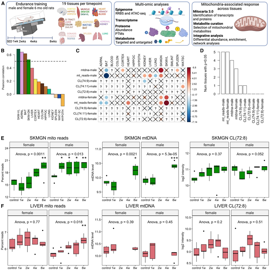 为了估计训练过程中线粒体体积的变化,他们定量了线粒体数量的生物标志物,包括心磷脂含量和环状线粒体DNA (mtDNA)拷贝数。在训练0周、1周或8周的动物中,mtDNA定量仅限于15个组织。心磷脂是与人类骨骼肌线粒体体积密切相关的线粒体膜特异性脂质。心磷脂数据来自肾脏、肝脏、肺、腓肠肌骨骼肌(SKM-GN)和皮下白色脂肪组织(WAT-SC)。在4种组织[SKM-GN、股外侧肌骨骼肌(SKM-VL)、肾上腺和BAT]中,映射到线粒体基因组的RNA-seq读长百分比可作为mtDNA的替代指标(图1B)。在19个组织中,有15个组织的至少一项生物标志物对训练有显著应答。重点关注第8周,8个组织的线粒体读数百分比发生了变化,响应方向与mtDNA一致(图1C-D)。此外,响应最高的性组织组合表现出线粒体编码转录本的一致响应,表明mtDNA的数量和转录活性都发生了变化(图1E)。相比之下,肝脏表现出轻微的反应,仅在雄性的上调(图1F)。总之,他们发现了线粒体生物标志物在训练反应中的实质性跨组织差异变化。