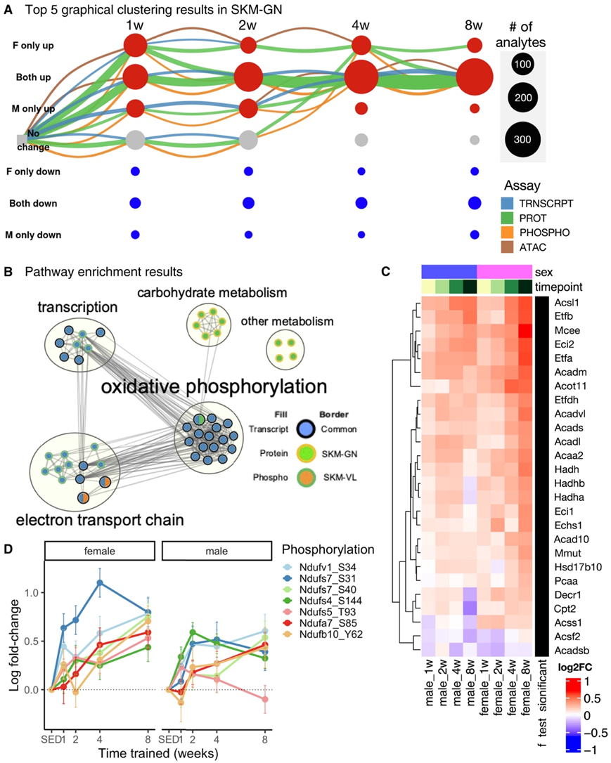 (A)通过构建汇总图来可视化分子训练响应的动态。(B)第8周分析物对应SKM-GN和SKM-VL性别一致上调节点的通路富集结果的网络视图。(C) SKM-GN蛋白组的脂肪酸氧化途径富集。(D)复合物I蛋白中显著差异蛋白磷酸化位点的变化。