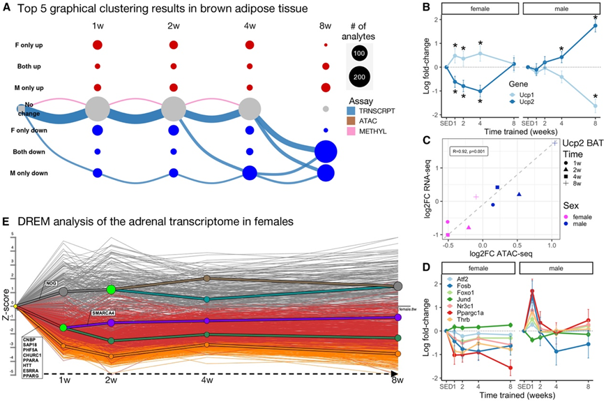 (A)棕色脂肪组织(BAT)中线粒体相关训练差异分析物的图示。(B) Ucp1和Ucp2在雌性(左)和雄性(右)中的表达模式。(C) Ucp2表达变化与染色质可及性的相关性。(D)已知PPARGC1A/PGC1 α互作物的表达变化。(E)雌性肾上腺MitoCarta基因的DREM分析结果预测了几个转录因子参与了1周的反应。
