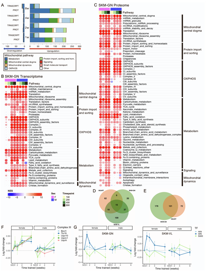(A) 在每个训练时间点,SKM-GN转录本和蛋白质中显著上调和下调的分析物的数量。 (B-C) 基因集富集分析(GSEA)结果。(D) 三种肌肉组织中训练差异转录本重叠的维恩图。(E) SKM-GN和HEART中训练差异蛋白重叠的维恩图。(F) 线粒体复合物III蛋白表达变化。(G) SKM-GN(左)和SKM-VL(右)中线粒体未折叠蛋白反应转录因子(TF)的转录变化。