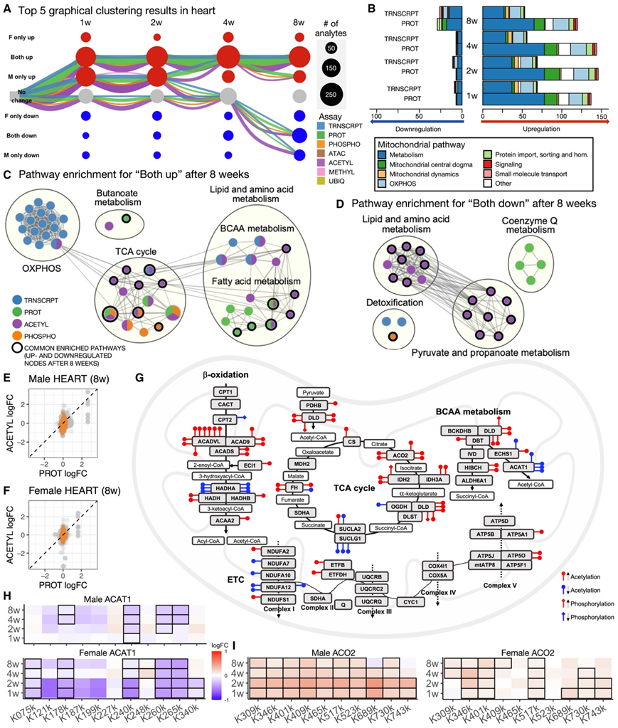 (A)心肌中线粒体相关训练差异分析物的图示。(B)在每个时间点显著上调和下调的线粒体相关转录本和蛋白的数量。(C-D)通路富集结果对应的网络视图。 (E-F)蛋白质水平变化和乙酰化水平的相关性。(G) 8周后雄性和雌性代谢蛋白乙酰化和磷酸化的变化。(H-I)ACAT1和ACO2位点特异性乙酰化变化。
