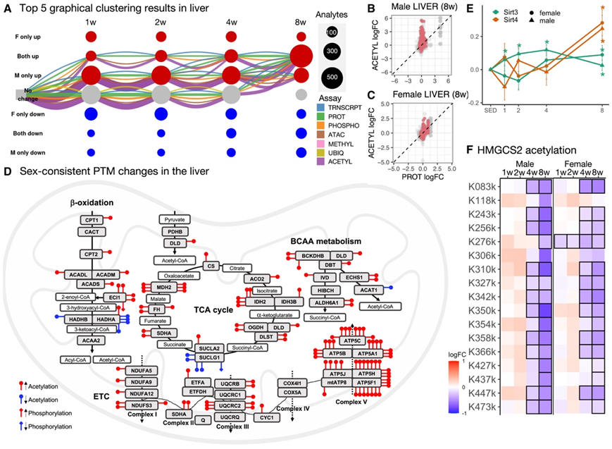 (A)肝脏中线粒体相关训练差异分析物的图示。(B-C)肝脏中蛋白质丰度变化与乙酰化的相关性。(D)训练8周后雄性和雌性肝脏线粒体代谢蛋白乙酰化和磷酸化的变化。(E) SIRT3和SIRT4蛋白表达变化。(F) HMGCS2位点特异性乙酰化变化。